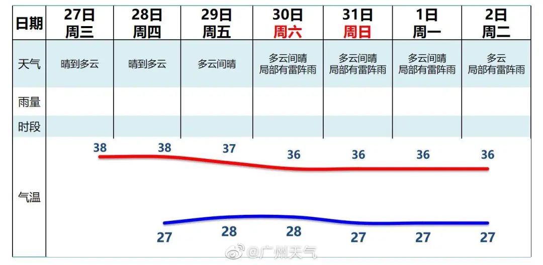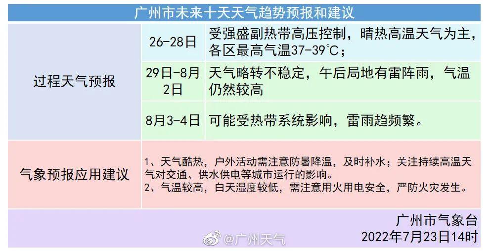 據(jù)廣州天氣消息,26—28日,廣州繼續(xù)受副熱帶高壓控制,晴熱高溫天氣為主,各區(qū)高氣溫37~39℃,