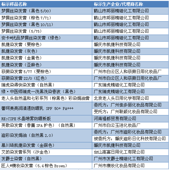 10月15日,藥監(jiān)局官網(wǎng)發(fā)布關(guān)于22批次不合格化妝品的通告(2019年 第71號),通報標(biāo)示名稱為艾的染發(fā)膏系列(沙金色)等的22批次化妝品檢出成分與經(jīng)批準(zhǔn)的特殊用途化妝品配方成分不符(見附表)。其中標(biāo)示為鶴山市邦麗精細(xì)化工有限公司、肇慶市凱捷科技有限公司各有5批次和4批次染發(fā)膏上榜;而號稱“娜扎同款”的韓國RE:CIPE水晶噴霧防曬新版也出現(xiàn)在不合格名單中。