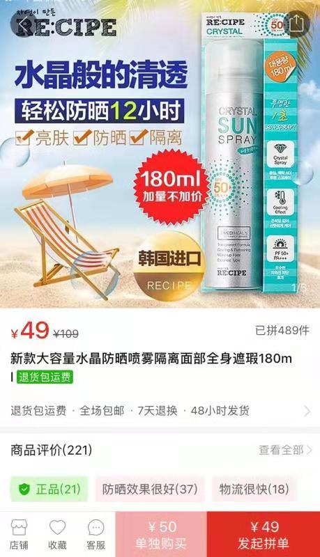 拼多多某店家銷售的RECIPE水晶噴霧防曬新版。此外,發(fā)爵士染膏(自然黑)、蕾珂美亮潤清透防曬乳 SPF 50+ PA+++等在京東、淘寶也有售,但銷量都不是很高。