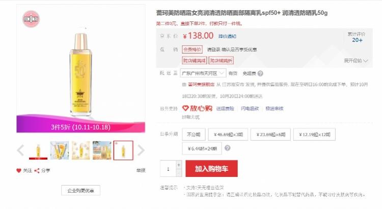 京東某商家銷售的蕾珂美亮潤清透防曬乳 SPF 50+ PA+++。