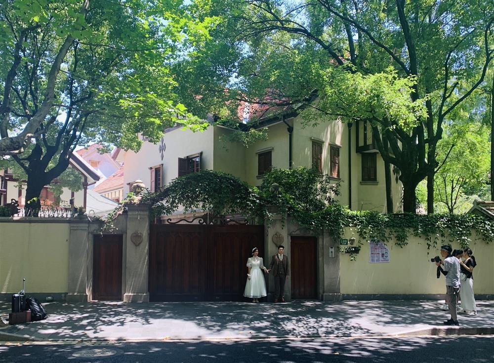 武康路109號風(fēng)格獨(dú)特,窗欞修繕得體,外墻粉刷成淺黃色,這個暗紅色的木質(zhì)大門是吸引拍照打卡的游客,拍婚紗照的新人也不會錯過,前后不到50米的路上,就有三對在拍攝的新人,拿著反光板的工作人員大都戴著大檐帽和大墨鏡,全身裹得嚴(yán)嚴(yán)實(shí)實(shí)。