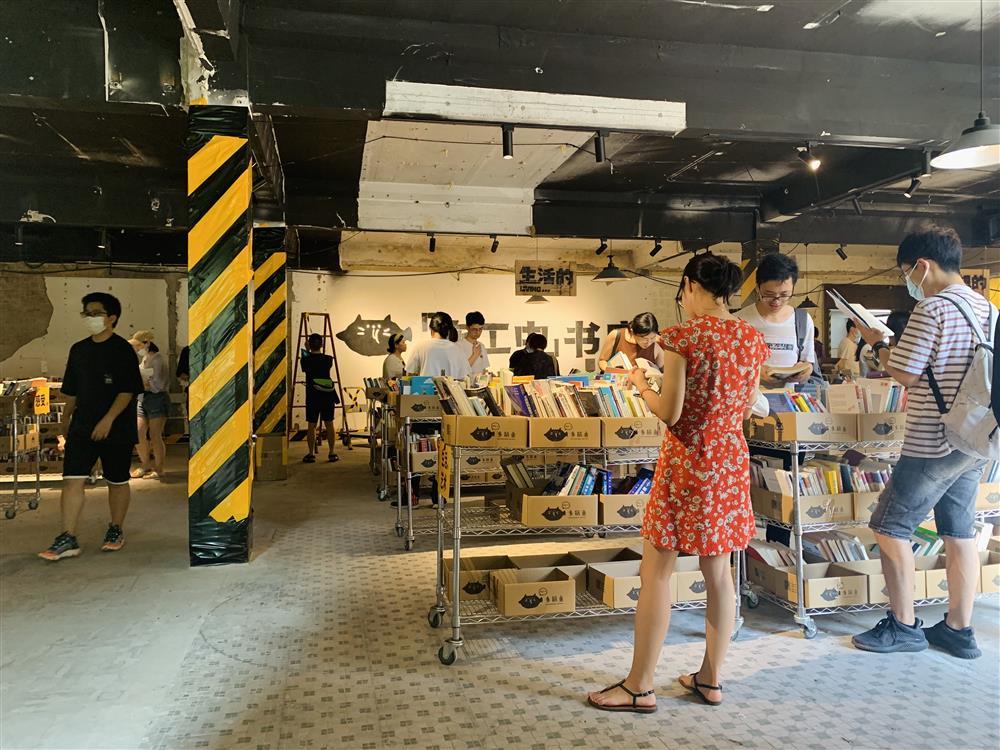 伴著輕搖滾,在書架中穿梭,有位抱著紙箱子淘書的顧客擦擦汗,笑說:“多抓魚是我很喜歡的二手書平臺,很有溫度,這個毛坯水泥的場地很特別,也真的有‘溫度’?!?/p>