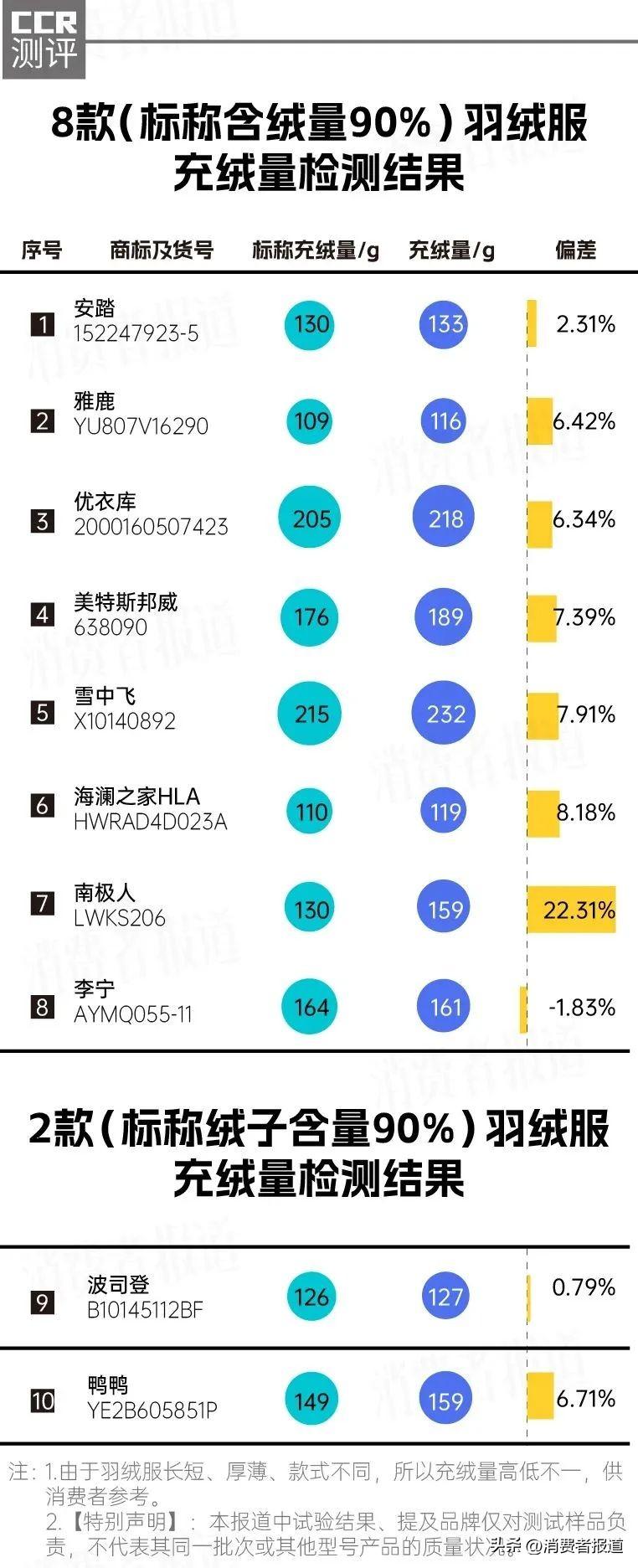 充絨量:李寧充絨量不及標(biāo)稱,南極人誤差大羽絨服重要的性能無疑是保暖。
