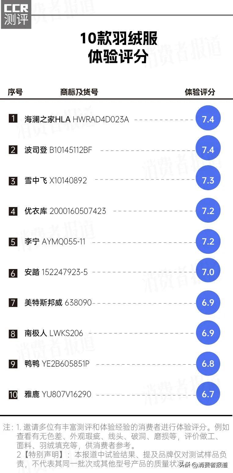 2022年12月,《消費(fèi)者報(bào)道》隨機(jī)選購(gòu)了市面上較熱銷的10款羽絨服進(jìn)行多項(xiàng)測(cè)試,品牌包括優(yōu)衣庫(kù)、安踏、李寧、美特斯邦威、海瀾之家HLA、雪中飛、南極人、雅鹿、波司登、鴨鴨。
