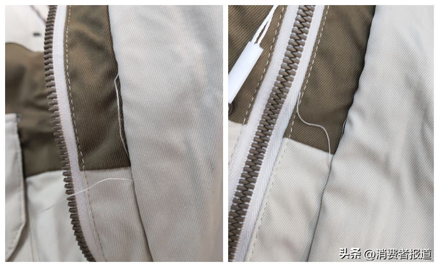 其中美特斯邦威 638090有的鉆絨現(xiàn)象,如下圖,在拉鏈處、袖口處均有羽絨鉆出,及不美觀,也影響穿著,長(zhǎng)期還影響保暖性能。腋下還有長(zhǎng)長(zhǎng)的線頭。