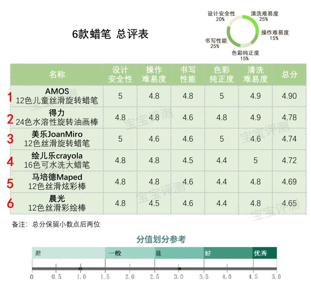 蠟筆評測總結(jié)經(jīng)過5項測試結(jié)果及加權(quán)平均計算,6款蠟筆終的總分及排名情況如下: