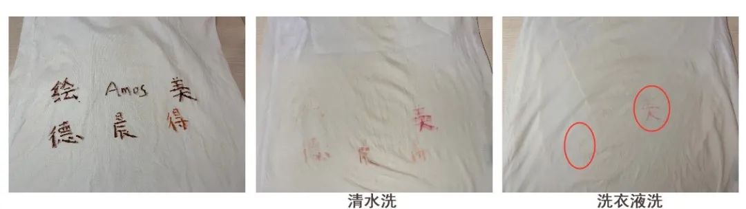 再用洗衣液搓洗,AMOS的字跡基本被洗掉,美樂、馬培德、晨光、得力還能看到一點痕跡。