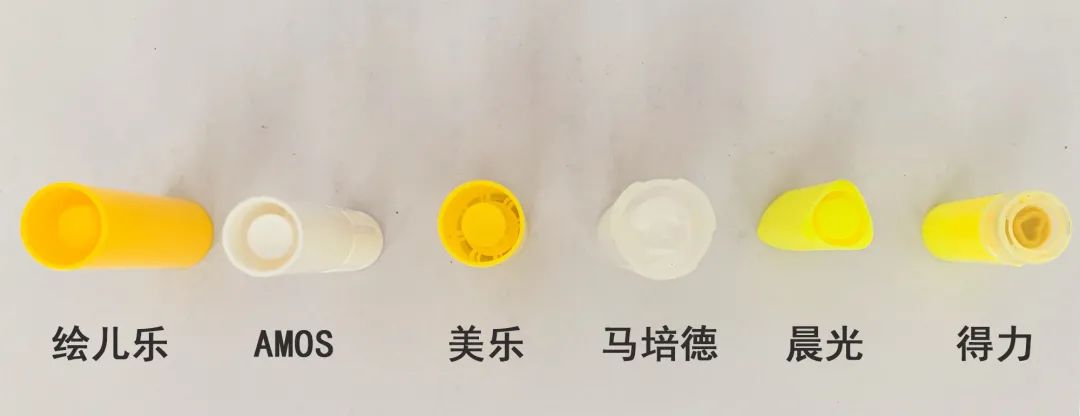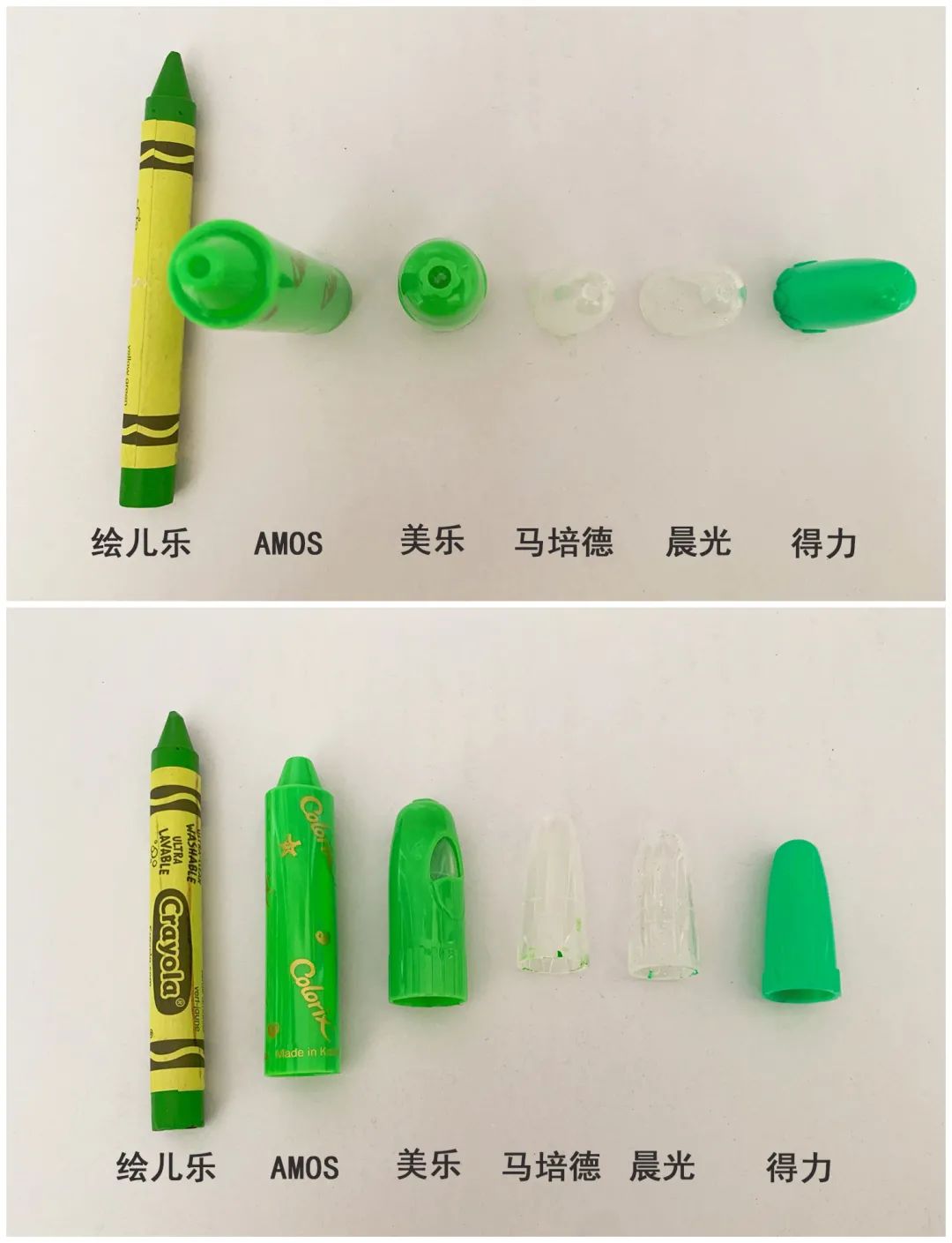 其他5款蠟筆的筆帽沒有設(shè)計通氣孔或通氣孔不,但尺寸均比較大,也是符合國標(biāo)要求的。其中,AMOS、美樂的筆帽尺寸較大,相對更。