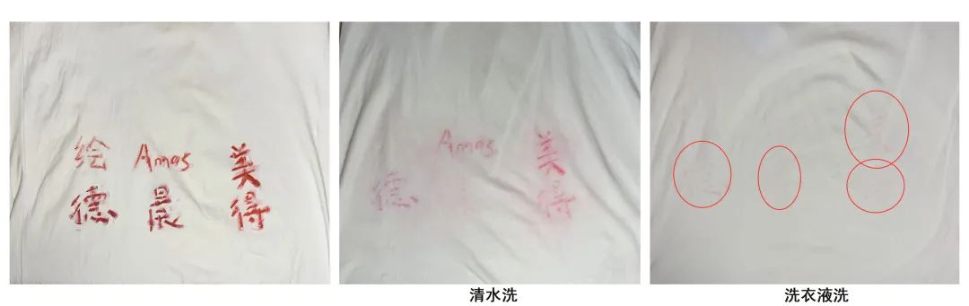 3、用各品牌的紅色蠟筆在衣服上寫字,30分鐘后用清水搓洗衣服。