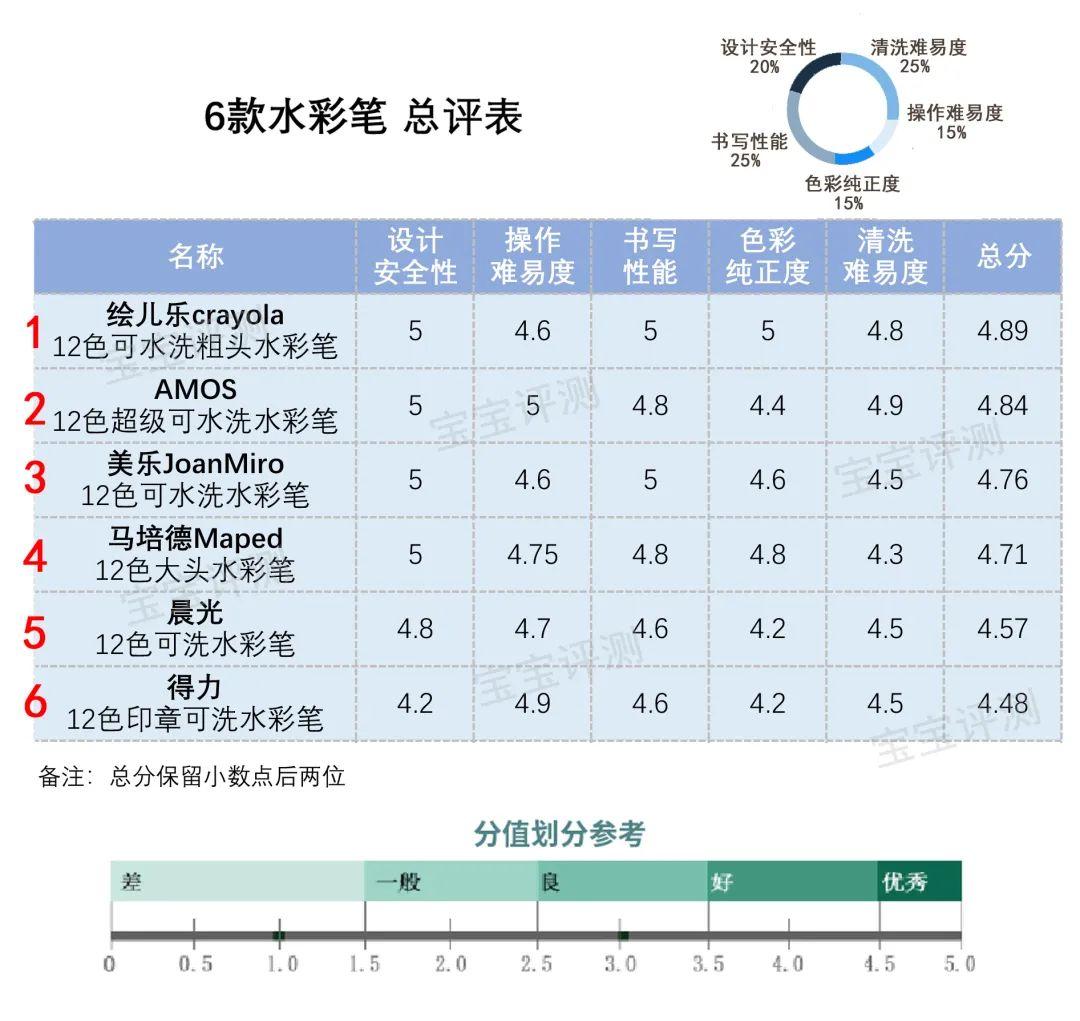 水彩筆評測總評經(jīng)過以上5個項目的評測后,笨爸爸給各項目按重要程度劃分了權(quán)重(具體權(quán)重見圖表),并進(jìn)行了加權(quán)平均計算。