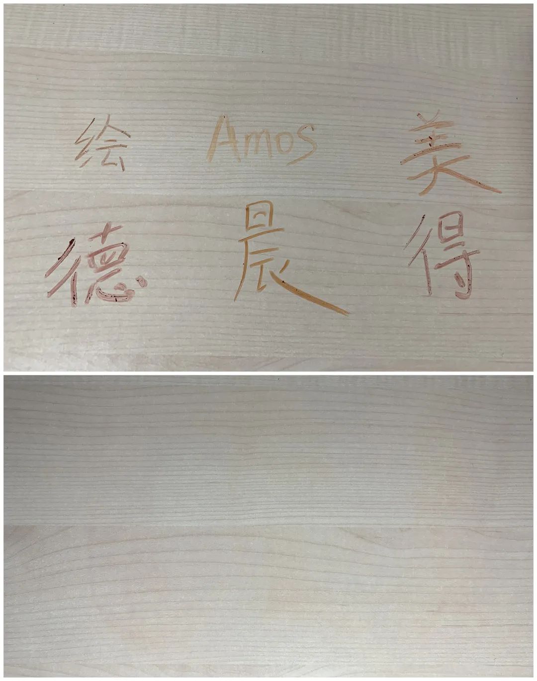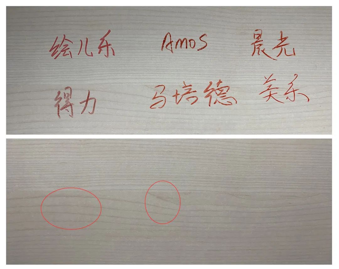 1、用各品牌的紅色水彩筆在桌面上寫字,30分鐘后用濕抹布擦拭桌面。