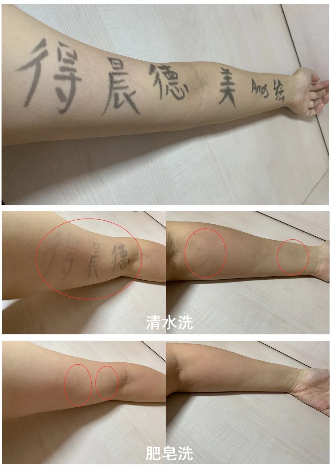2、用各品牌的黑色水彩筆在胳膊上寫字,30分鐘后用清水搓洗胳膊。
