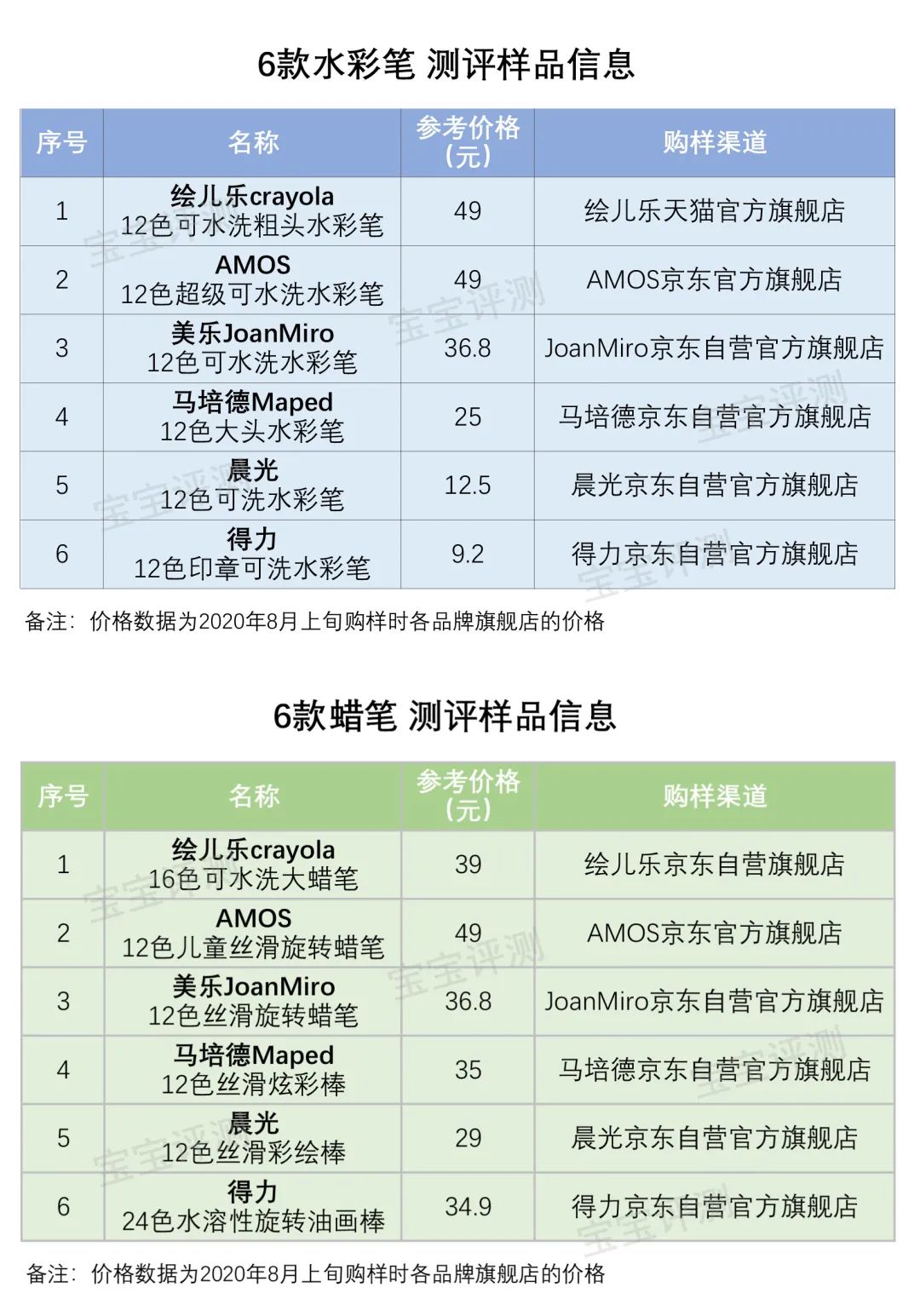 以下是6款水彩筆、6款蠟筆的評測樣品信息: