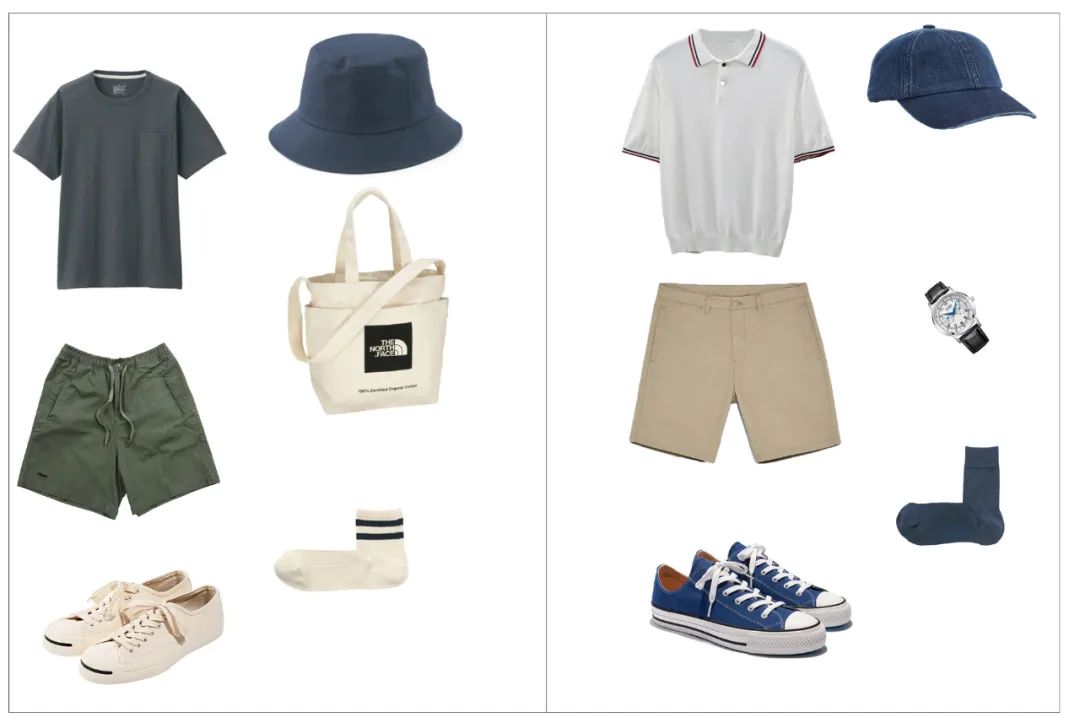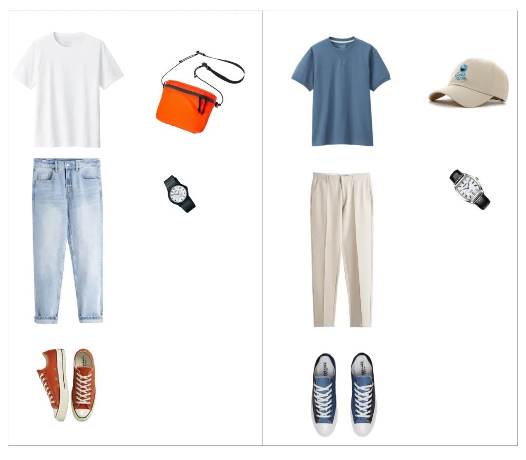 8.藍(lán)白色在夏季是讓人感覺(jué)到清爽感強(qiáng)色系搭配,所以想顯得清爽干凈的可以多試試藍(lán)白搭配,常見(jiàn)的是白色T+牛仔褲,或者藍(lán)色T+米白色休閑褲等等,利用鞋子或者配飾做點(diǎn)綴,這里隨便搭兩套參考一下: