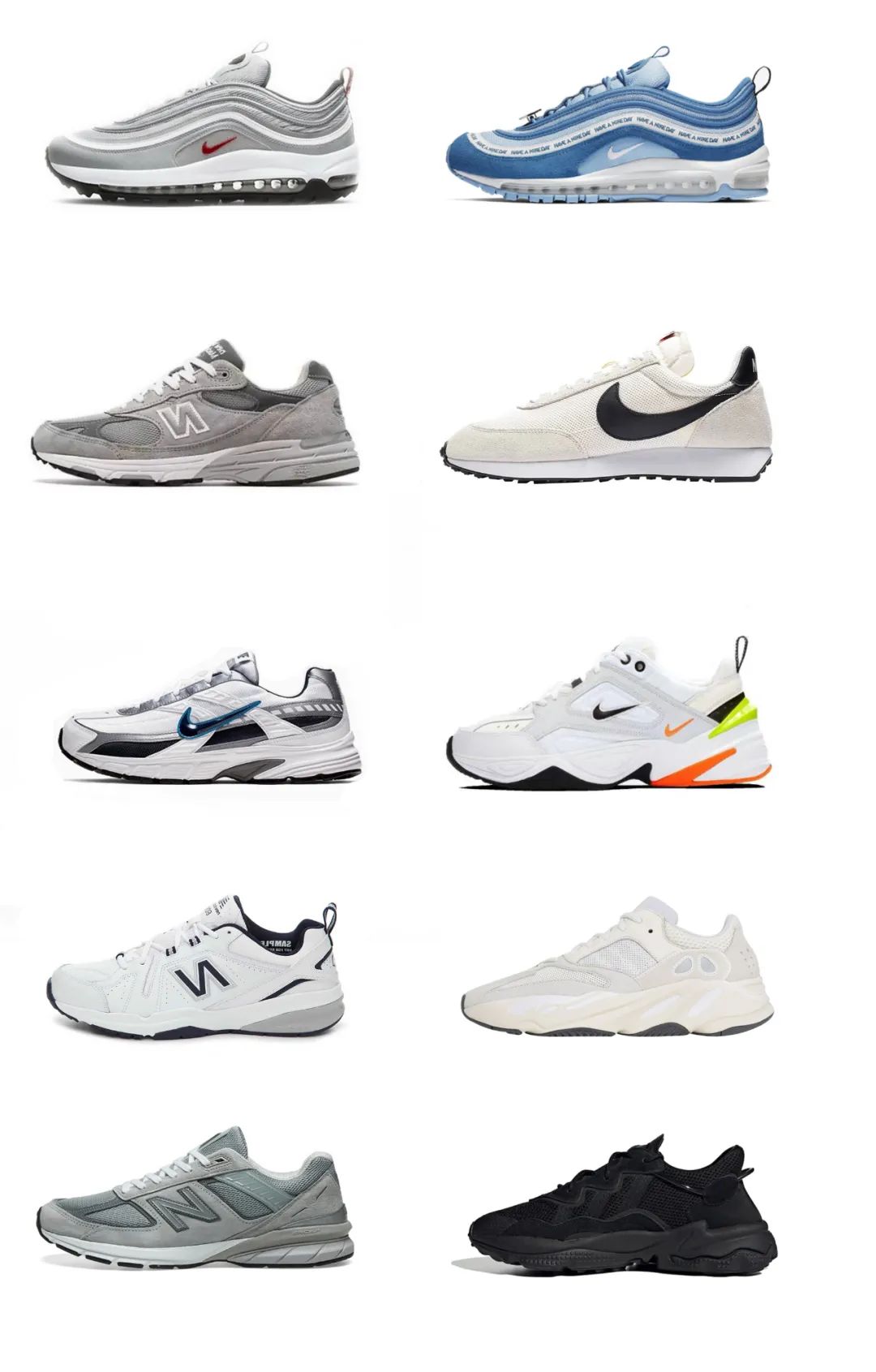 常見(jiàn)的nike的max 95/97/98,NEW BALANCE 的608/990/991/993,adidas系列的等等其他品牌都可以,關(guān)于運(yùn)動(dòng)鞋球鞋這方面很多男生比我懂得更多,這里不談舒適度,只舉例一些比較簡(jiǎn)單百搭的款式: