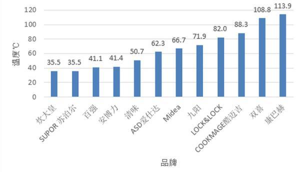 是根據(jù)用戶日常握持不粘鍋手柄的角度和位置確定布溫點(diǎn),檢測(cè)手柄接觸點(diǎn)的溫度,讀取其空載工作至穩(wěn)定(約1h)的高溫度。在加熱的過(guò)程中,手柄溫度越高,存在的燙傷風(fēng)險(xiǎn)就會(huì)越大。12款樣品中: