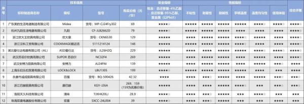 本次比較試驗(yàn)分別檢測(cè)不粘鍋的不粘性、耐磨性、耐堿性、手柄溫度、溫度均勻性和使用體驗(yàn)6個(gè)指標(biāo)。測(cè)試結(jié)果顯示: