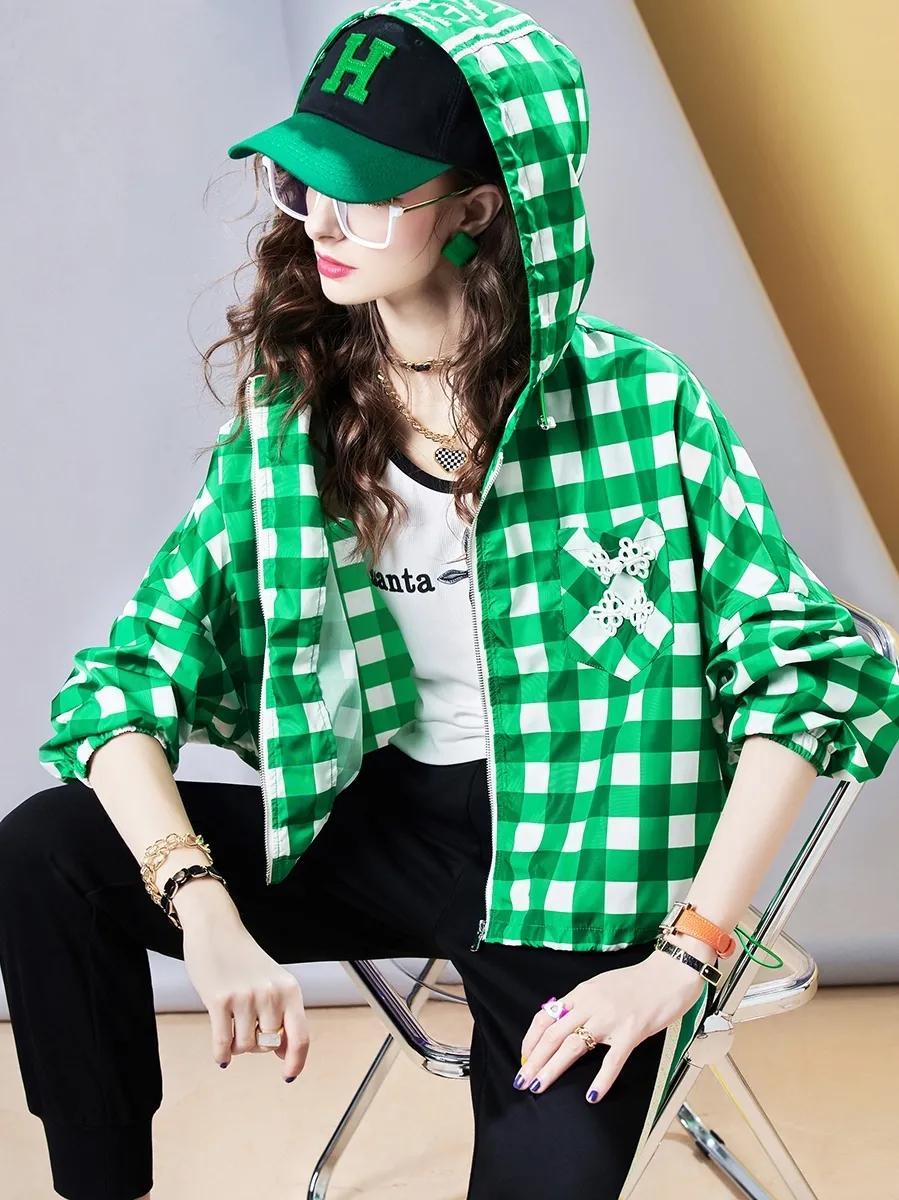 棋盤格防紫外線連帽短袖外套女透氣薄款防曬服