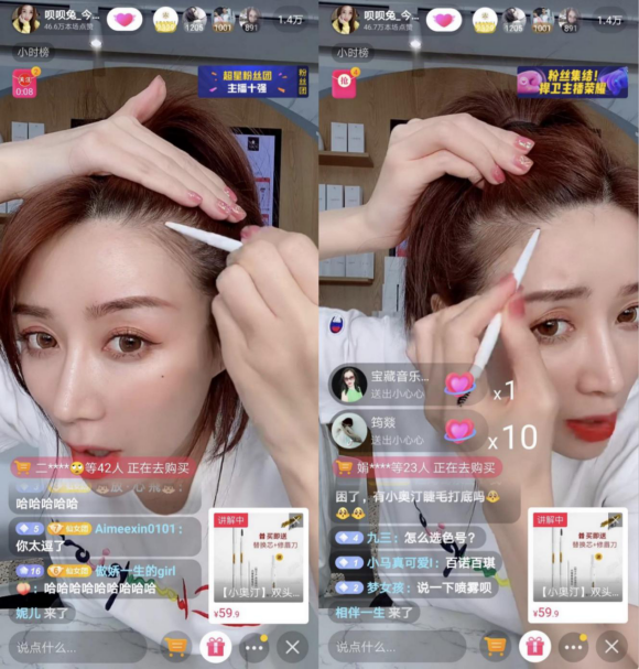 在推薦一款眉筆時(shí),唄唄兔當(dāng)場(chǎng)卸掉畫(huà)的眉毛,演示起這款眉筆“根根分明”的果。唄唄兔還為大家演示了如何用這款眉筆一分鐘拯救發(fā)際線(xiàn),她說(shuō)“夏天出門(mén)可以不化妝,一定要化發(fā)際線(xiàn)!”作為精致女孩任何小細(xì)節(jié)自然都不能放過(guò),畢竟飽滿(mǎn)發(fā)際線(xiàn)配丸子頭才是少女的夏天!