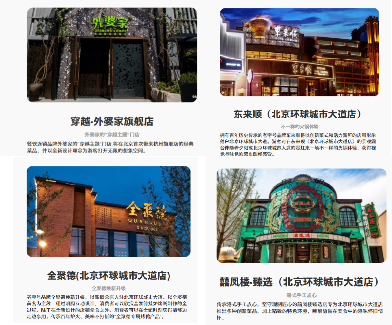 它們也在通過別具一格的店面設(shè)計和菜式融入“環(huán)球”氛圍,更迭品牌印象。例如餐飲連鎖品牌外婆家開設(shè)了北京“穿越主題”門店;北京全聚德、東來順,囍鳳樓臻選店則選擇創(chuàng)新菜式或產(chǎn)品招攬年輕人,其中全聚德還推出了DIY烤鴨的活動。