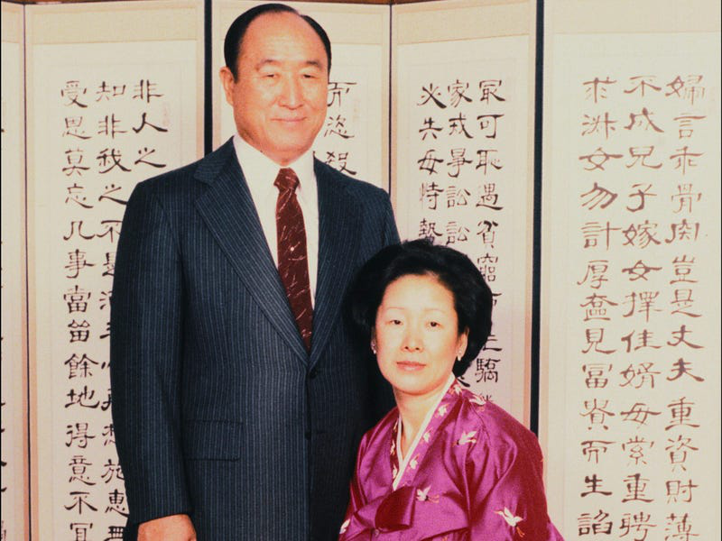 1947年,文鮮明因異端邪說被韓國長老會開除,七年后他正式創(chuàng)辦“統(tǒng)一教”。1953年,他與第一任妻子崔元吉(Sun Gil Choi)離婚,理由是她無法接受他的教義。離婚七年后,他迎娶了他認為的“女人”韓鶴子(Hak Ja Han),兩人被信徒們奉為潔凈人世的“真父母”,他們的親生孩子則被稱為“真子”。