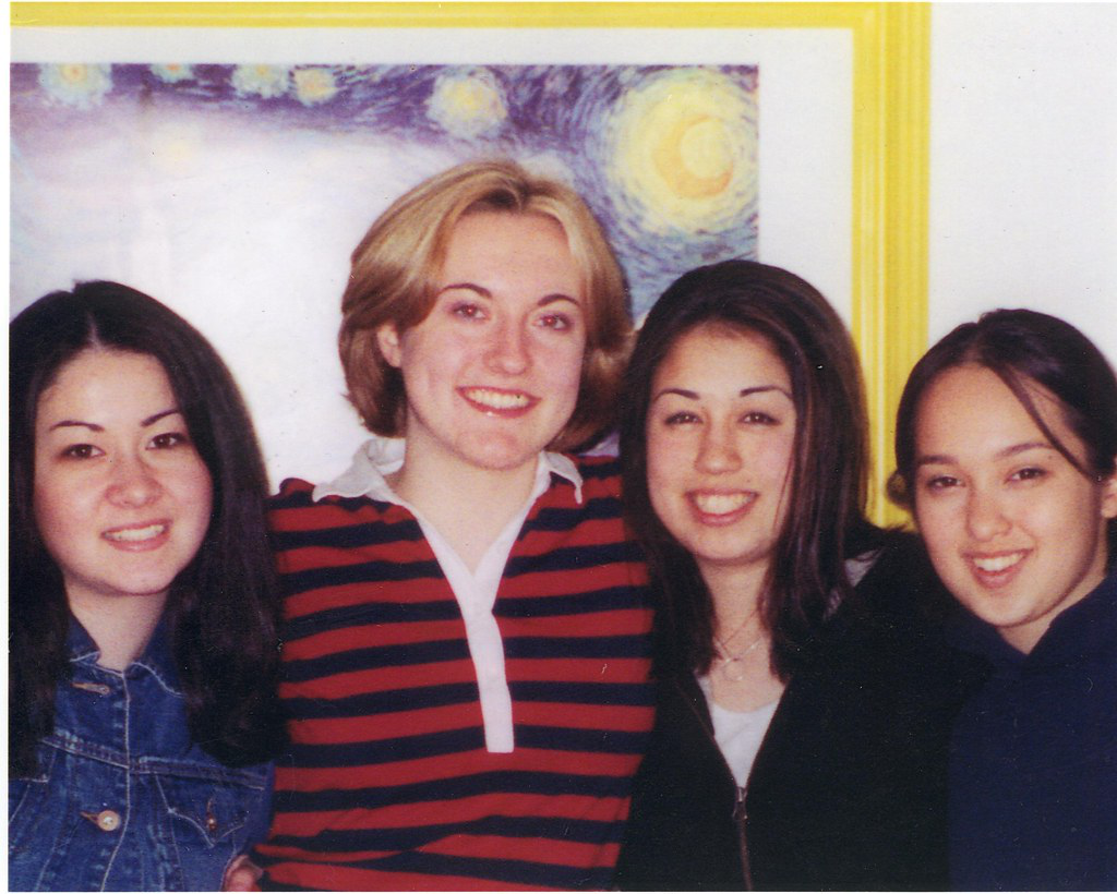 ▲2002年8月,年僅18歲的金珠·伯恩(左二)在一座公寓大樓里銷售服飾品替“統(tǒng)一教”募捐,被一名21歲的男子綁架、搶劫并勒死。(互聯(lián)網(wǎng)圖)