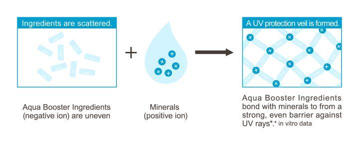 雖然也是用了w/o的配方,但是Aqua Booster的技術(shù)就是而且反其道而行之,當(dāng)皮膚上的防曬產(chǎn)品接觸到水以后,反而會增強(qiáng)對紫外線的吸收能力,提升程度達(dá)到20%,也就是說SPF50的產(chǎn)品在出汗以后,反而可以到SPF60