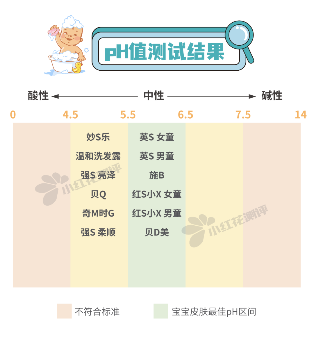 英S女童、英S男童、施B、紅S小X女童、紅S小X男童、貝D美的pH值在5.5-6.5之間(由低到高排列),更接近寶寶頭皮pH,更溫和。