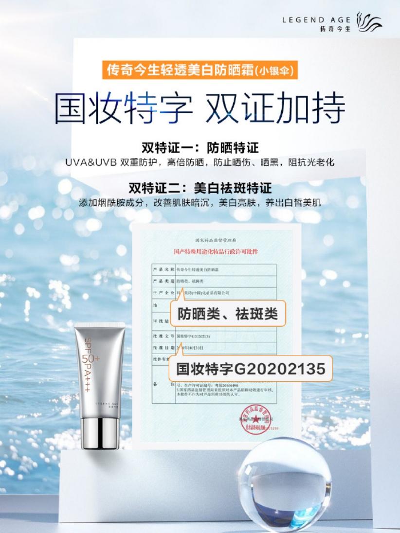 近日,傳奇今生輕透美白防曬霜(又名“小銀傘”)新品上市,不僅取得了“國妝特字”認(rèn)證,還是防曬、祛斑雙證加持,批準(zhǔn)文號為國妝特字G20202135?!靶°y傘”一經(jīng)推出就迅速引爆市場,成為粉絲瘋狂種草的全新爆款單品。在藥品監(jiān)督管理局為其頒發(fā)的國產(chǎn)特殊用途化妝品行政許可批件中,我們可以在產(chǎn)品類別中看見,“小銀傘”取得了防曬類、祛斑類雙重認(rèn)證。也就是說,這款“小銀傘”不僅擁有SPF50+、PA+++的高倍防曬特證,能有防護(hù)UVA&UVB對皮膚的損傷,防止曬傷、曬黑,阻抗光老化;還擁有美白祛斑特證,通過其添加的煙酰胺成分,改良肌膚暗沉,美白亮膚,有祛斑,幫你輕松養(yǎng)出白皙美肌。
