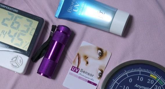 溫度計(jì)(電子版、機(jī)械版)、紫外線筆、紫外線試紙、優(yōu)衣庫(kù)防曬服、知名品牌防曬霜。