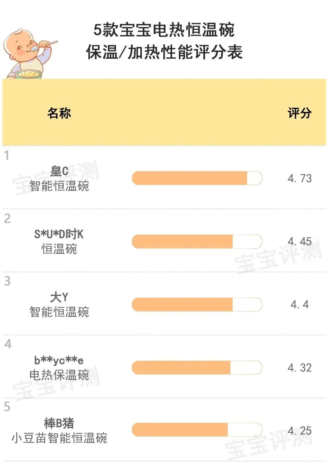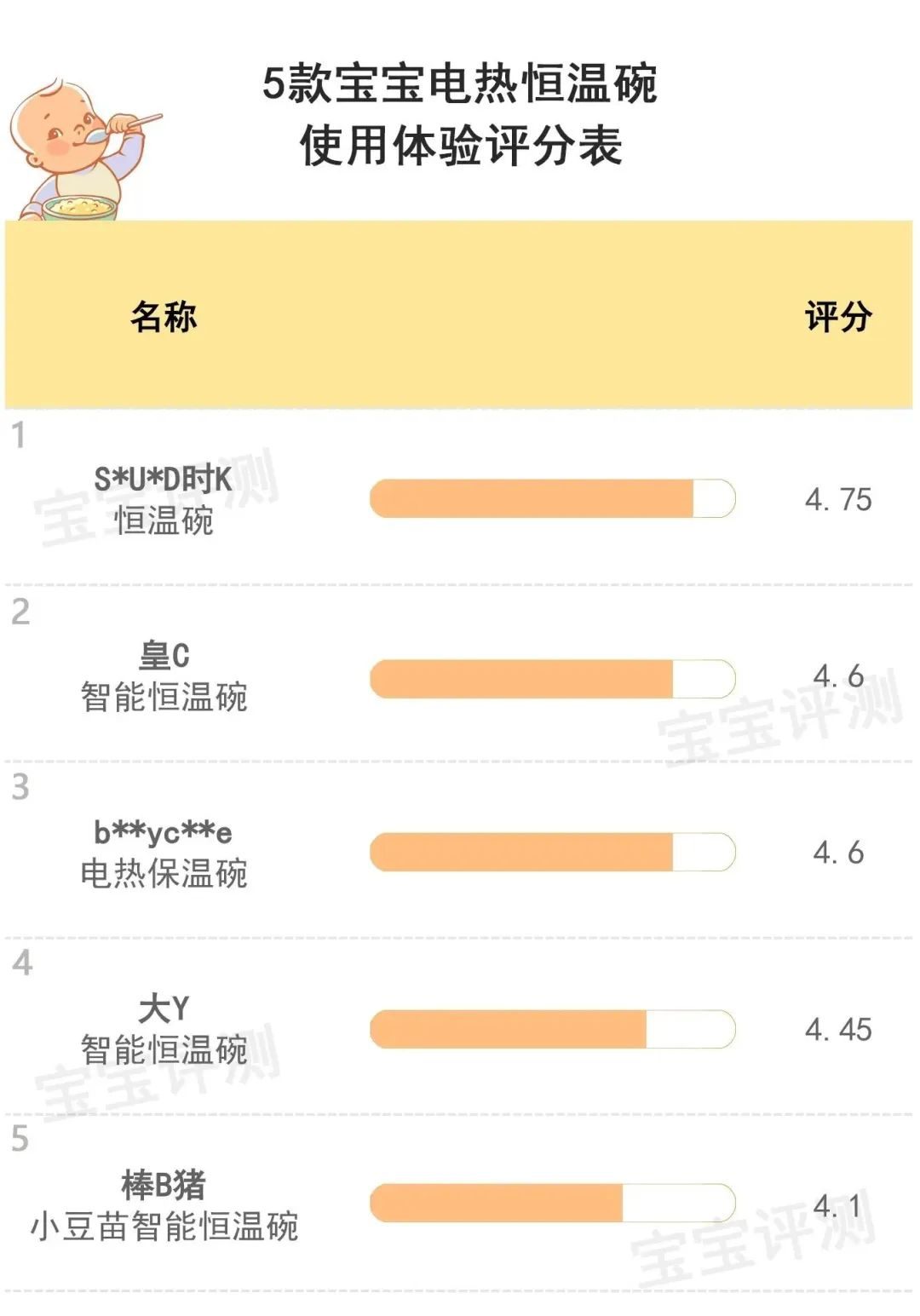 總評(píng)及綜合推薦綜合以上幾項(xiàng)評(píng)測(cè)結(jié)果,為給大家提供一個(gè)相對(duì)比較直觀的參考,笨爸爸對(duì)5款寶寶電熱輔食碗進(jìn)行了評(píng)分及排名: