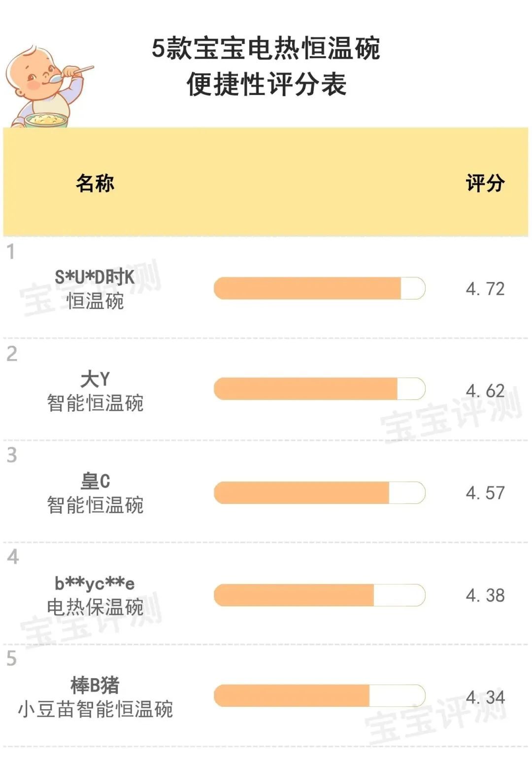 綜合以上分析,5款寶寶電熱輔食碗笨爸爸給出的便捷性評(píng)分情況如下: