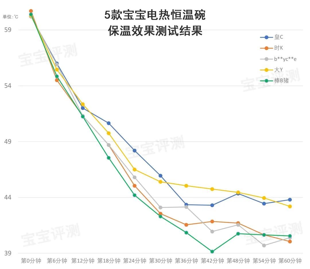 評(píng)測(cè)方法:①模擬寶寶邊吃邊玩情境,25℃室溫環(huán)境下,在各樣品內(nèi)裝入250mL、相同質(zhì)地的60℃米糊,選擇“熱調(diào)”保溫模式(大Y為48℃,其他4款為45℃,以下同),不蓋蓋子、不攪拌,每隔3分鐘測(cè)量一次粥上部、下部的實(shí)際溫度,測(cè)試時(shí)間1小時(shí)。