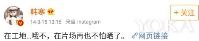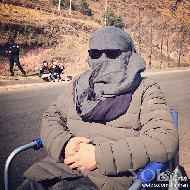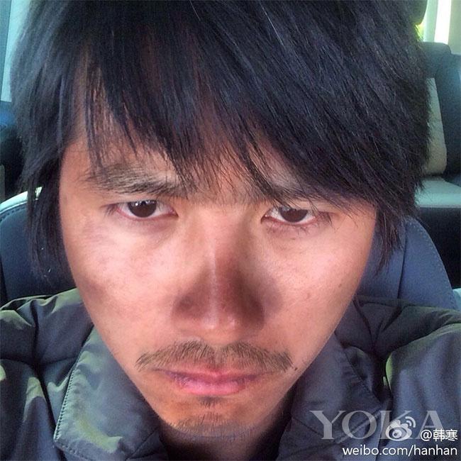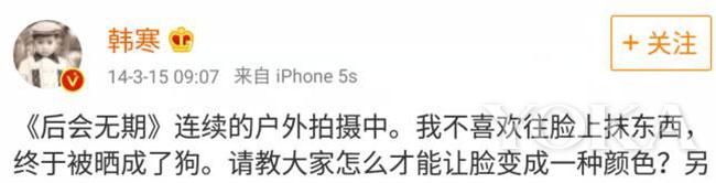 韓寒由于不喜歡在臉上抹防曬霜,結(jié)果被曬成土黑色。