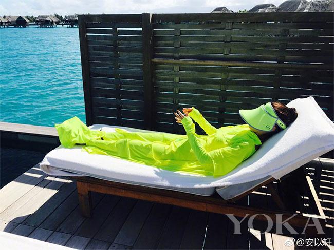 安以軒去海邊度假,為了防曬也是也是煞費(fèi)苦心。從頭到腳都被熒光色的防曬衫裹完了,只剩十根手指頭還暴露在陽光下。