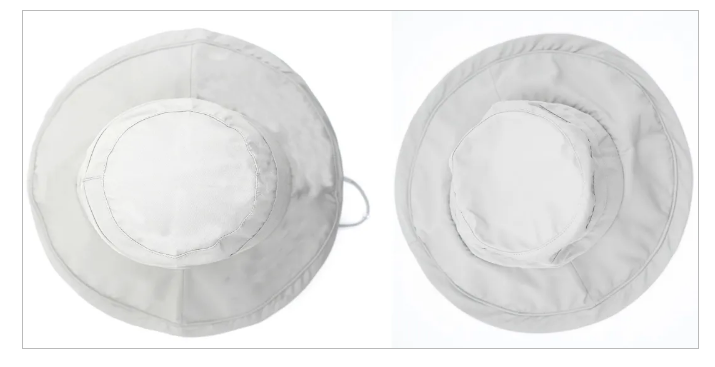 該款防曬帽因為周邊內(nèi)嵌有金屬絲,不適合機洗,我們采取手洗方式進行了五次洗滌、輕擰、懸晾。帽子水洗后,帽檐表面依舊平整,尺寸沒有變化。不過金屬絲周邊比較容易起皺,需要在蒸汽熨燙后才能恢復平整。