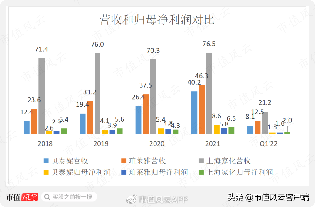 也正是由于貝泰妮業(yè)績(jī)?cè)鏊伲?018年還是小弟,到2021年公司的營(yíng)收已經(jīng)逼近珀萊雅,2020-2021年公司的歸母凈利潤(rùn)更是后來(lái)居上,力壓珀萊雅和上海家化。