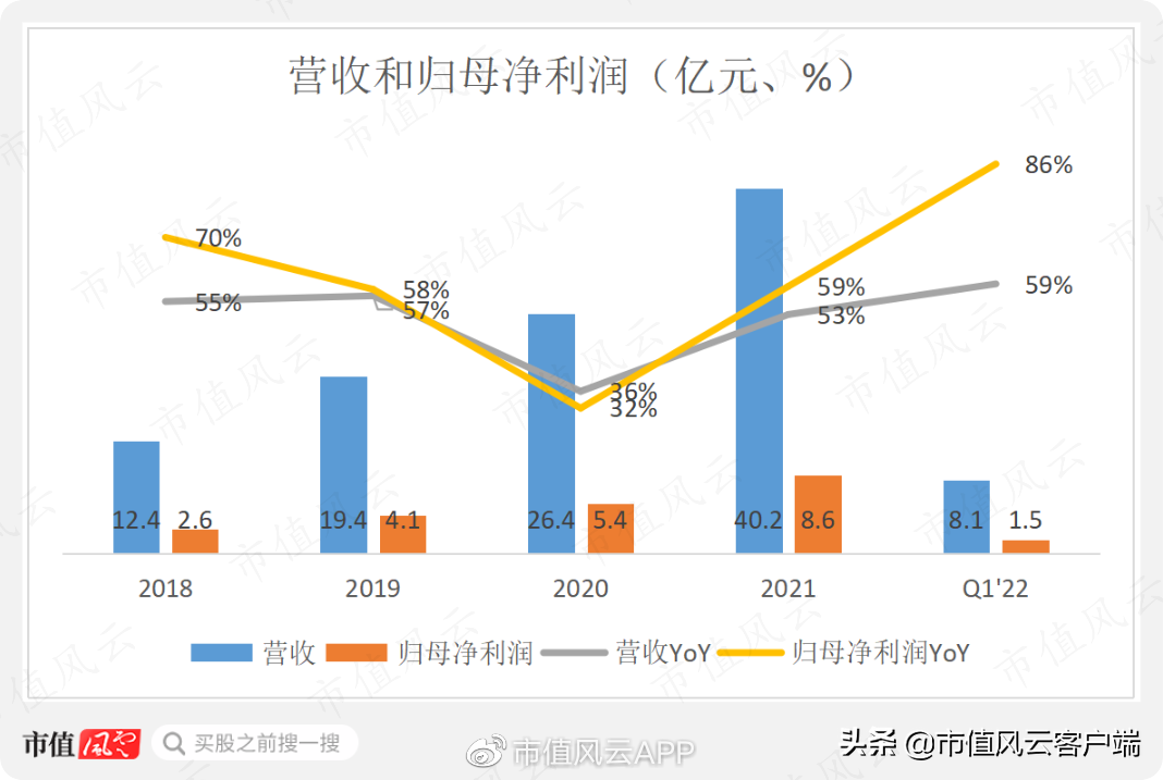 從業(yè)績(jī)?cè)鏊賮?lái)看,公司的營(yíng)收和歸母凈利潤(rùn)增速除2020年在30%左右之外,其他年份均在50%以上,2018-2021年CAGR分別為48%和49%,妥妥的高增長(zhǎng)。