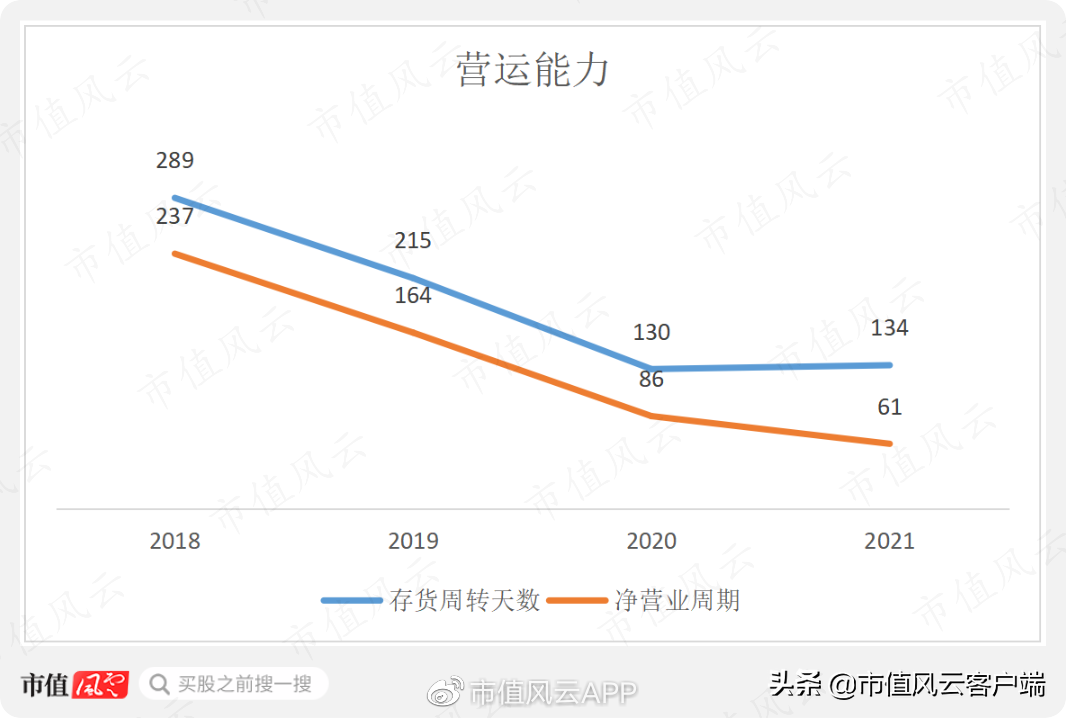 2018-2021年,貝泰妮存貨周轉(zhuǎn)天數(shù)由289天大幅下降為134天,凈營(yíng)業(yè)周期也從237天下降到61天,營(yíng)運(yùn)能力改良極為顯著。