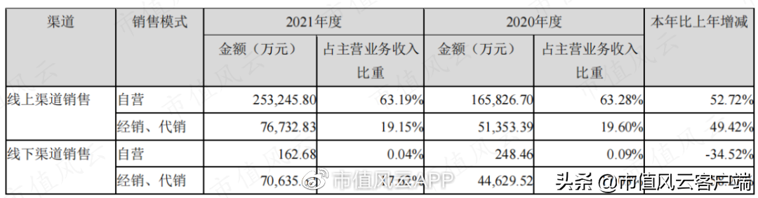 貝泰妮一直都是靠線上渠道銷(xiāo)售發(fā)力的,2019-2021年貝泰妮線上渠道銷(xiāo)售占比分別為77%、83%和82%,其中毛利率較高的線上自營(yíng)渠道銷(xiāo)售占比分別為61%、63%和63%。