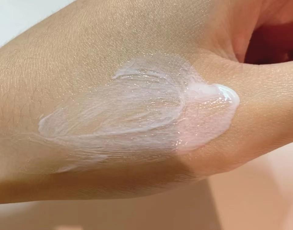 相比于一般高倍防曬而言,這款因?yàn)橛芯凭募尤?,所以膚感是比較水潤的。輕薄乳感的質(zhì)地流動(dòng)性比較強(qiáng),成膜速度也會(huì)很快。