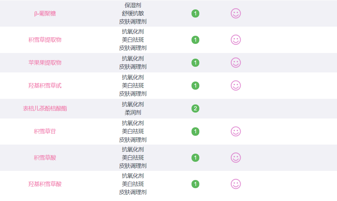 后面的活性成分有積雪草、蘋果果等植物提取物,主要是抗氧化、美白祛斑,功成分不含防腐劑、香精等,度之高。