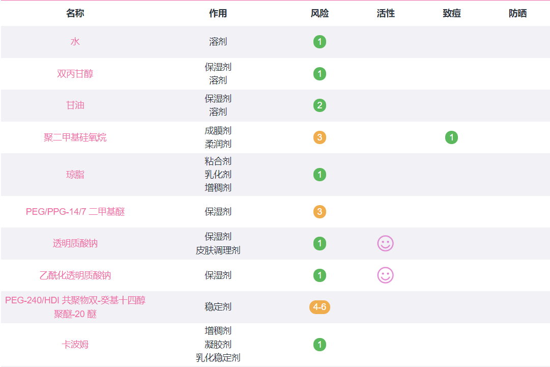 主要成分中有雙丙甘醇(保濕)、甘油(保濕)、聚二甲基硅氧烷(肉村)瓊脂(乳化)PEG/PPG-14/7 二甲基醚(保濕)透明質(zhì)酸鈉(保濕)等,成分談不上豪華,尤其是相對前面的產(chǎn)品來說,屬于比較普通的類型,含有部分香精、防腐劑。