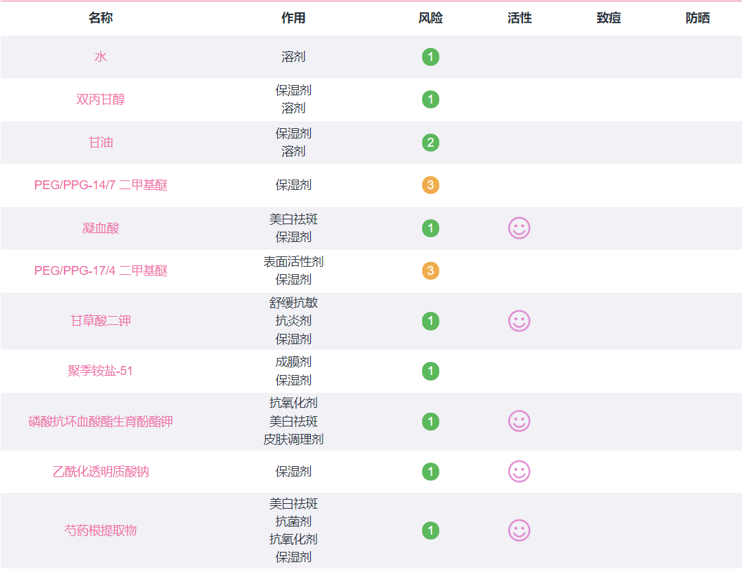 作為一款保濕爽膚水,它的成分如下:水、雙丙甘醇(保濕劑)、甘油(保濕劑)、PEG/PPG-14/7 二甲基醚(保濕劑)、凝血酸(美白祛斑)、甘草酸二鉀(舒緩抗敏)、聚季銨鹽-51(成膜保濕)、磷酸抗壞血酸酯生育酚酯鉀(抗氧化)、乙酰化透明質(zhì)酸鈉(保濕劑),可以看到前幾位的成分中保濕、抗氧化成分居多,成分偏向鎮(zhèn)靜皮膚、保濕舒緩。