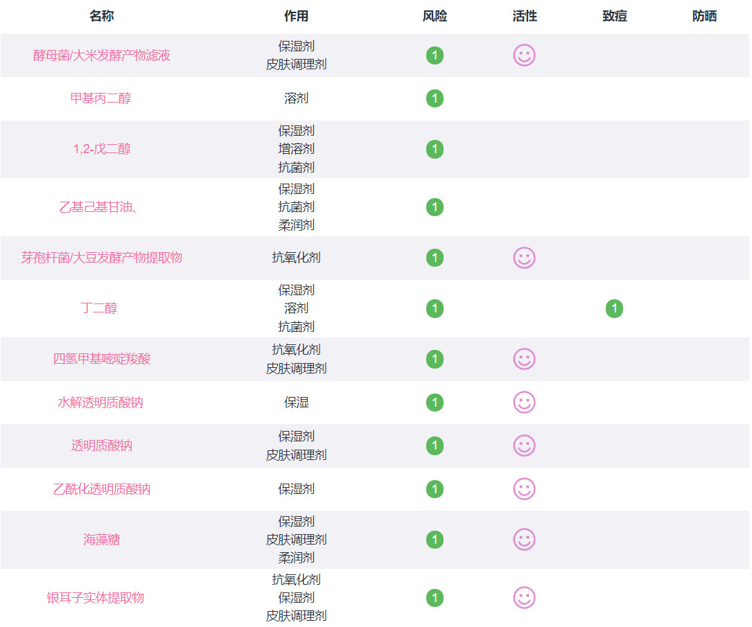 成分方面,糙米發(fā)酵提取物(保濕調(diào)理)、甲基丙二醇(溶劑)、1,2-戊二醇(保濕抗菌)、乙基己基甘油(保濕抗菌)、芽孢桿菌/大豆發(fā)酵產(chǎn)物提取物(抗氧化)、丁二醇(保濕抗菌)、四氫甲基嘧啶羧酸(抗氧化)、水解透明質(zhì)酸鈉(保濕)、透明質(zhì)酸鈉(保濕調(diào)理)、乙酰化透明質(zhì)酸鈉(保濕)等。除此之外還有多種微量活性提取物,整體安心度高,沒有防腐劑、香精之類,各類肌膚都能用。