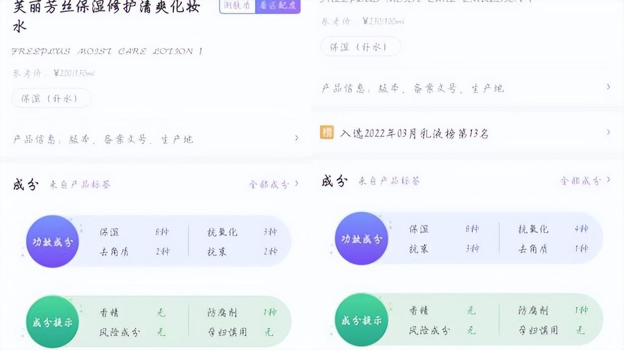 其中,珂潤(rùn)、芙麗芳絲、蘇秘都添加了1種防腐劑;紅色小象、嬌韻詩(shī)和黛珂分別添加了一種香精和防腐劑;