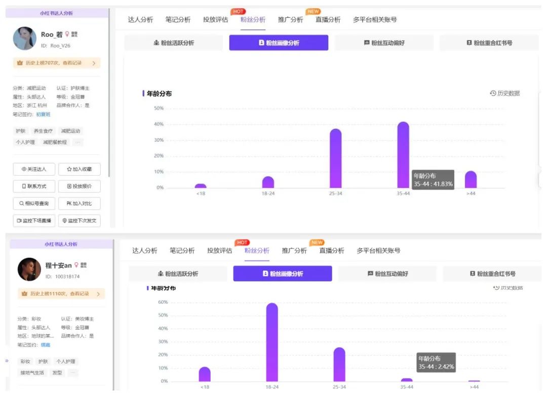 以40歲安妮姐姐與Roo_若為例,這2位博主在35-44歲的人群占比約為40%,而駱王宇和程十安這2位美妝頭部博主,該人群占比僅為個位數(shù)。
