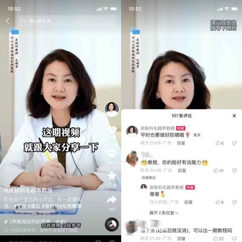“正面案例是譬如‘皮膚科毛越萍教授’這個賬號,是專業(yè)知識+形象結(jié)合的代表之一,粉絲粘性是很高的。如果能商業(yè)變現(xiàn),應(yīng)該有挺多抗衰品牌想與她這種類型的博主合作?!?/p>