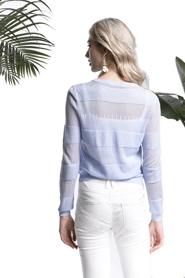 這款針織衫用不同薄厚及鏤空設計來增加整件衣服的層次感,讓看起來普通的針織衫不再單調(diào)無趣,上面的不同通透感的鏤空設計耐人尋味也透出一絲的性感。