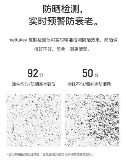 隨著年齡、氣候或地域的變化,每個(gè)人的皮膚都可能發(fā)生改變。美圖meitukey 皮膚檢測(cè)儀,可以隨時(shí)隨地準(zhǔn)確解讀皮膚狀態(tài),第一時(shí)間調(diào)整護(hù)膚方案。在幫助用戶科學(xué)美膚、真正改良肌膚狀態(tài)同時(shí),meitukey 皮膚檢測(cè)儀還可實(shí)時(shí)檢測(cè)防曬果,測(cè)評(píng)你的防曬工作是否到位,如檢測(cè)出防曬霜涂抹不均勻則會(huì)提示補(bǔ)涂。